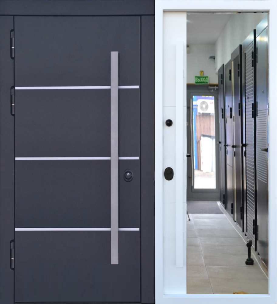 Входная европейская дверь Бавария МДФ окрашен эмалью, три молдинга, ручка скоба на лицевой стороне и большое зеркало с фальцетом на внутренней панели.