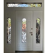 Большая входная дверь в частный дом состоит из полотна двух боковых створок одна из которых открывается и верхней фрамуги, каркас изготовлен из толстого металла отделан массивом дуба с фрезеровкой, установлено четыре стекло пакета.