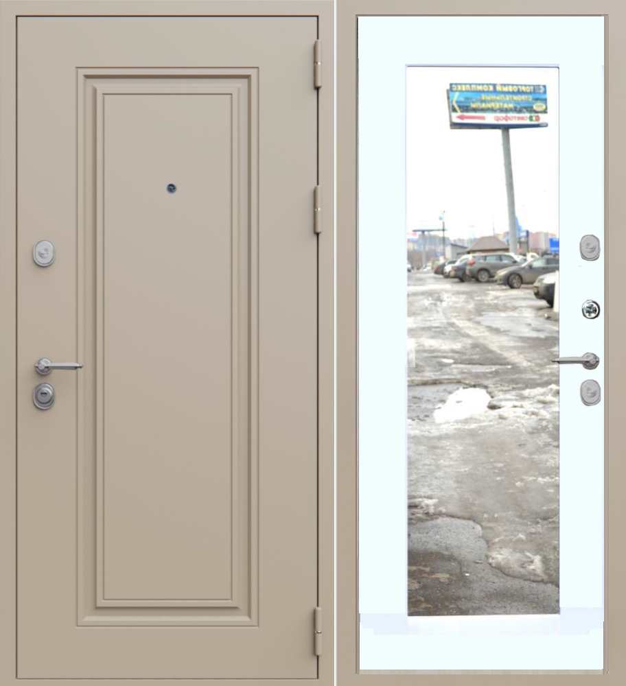 Входная дверь бежевого цвета из толстого пресс формированного металла с классическим рисунком, имитирующим фрезерованный прямоугольник в центре полотна, изнутри панель МДФ с большим зеркалом в центре.