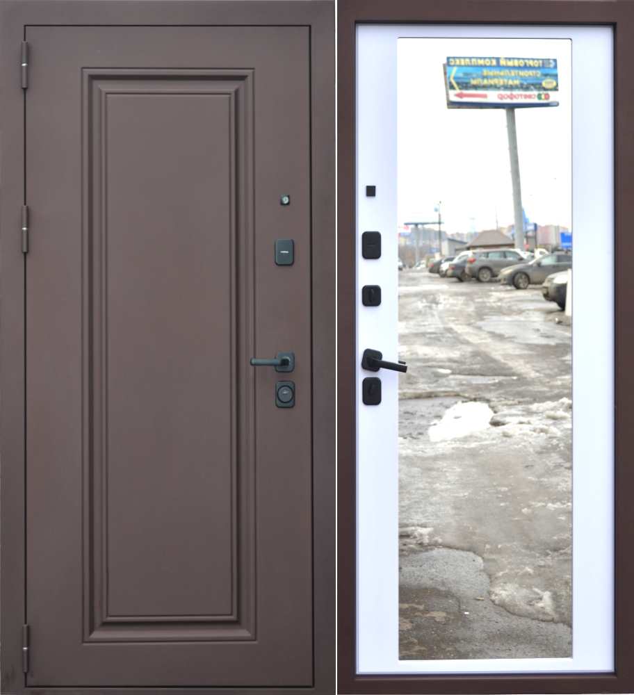 Надёжная входная дверь с тиснёным рисунком Classic на лицевой металлической стороне и большим зеркалом на МДФ панели внутренней, с отличным утеплением и шумоизоляцией.