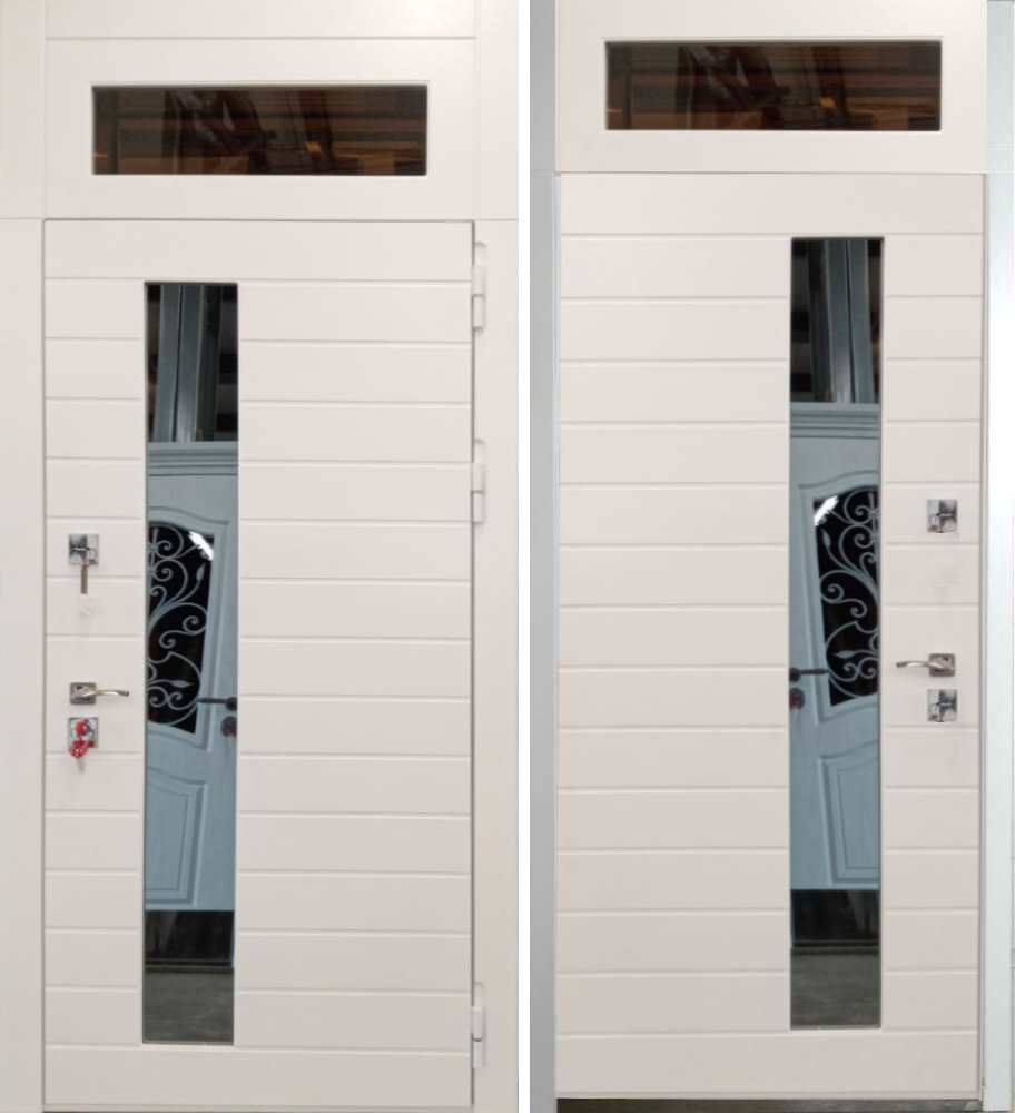 Высокая входная дверь с двумя прямоугольными стёклами в полотне и фрамуге, модель названа в честь самого высокого перевала в Европе, изготовлена из металла 1.5 мм, утеплена плотной минеральной плитой, выполнен полный терморазрыв на раме и полотне.