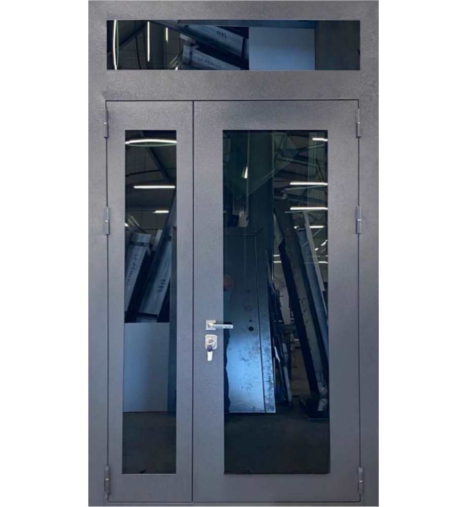 Двустворчатая входная дверь из толстого металла с верхней фрамугой и максимальной площадью остекления, прекрасная альтернатива дверям из ПВХ, при этом намного надёжнее.