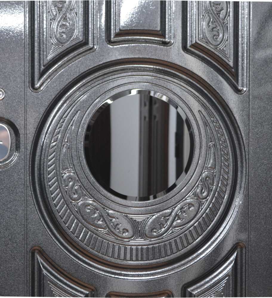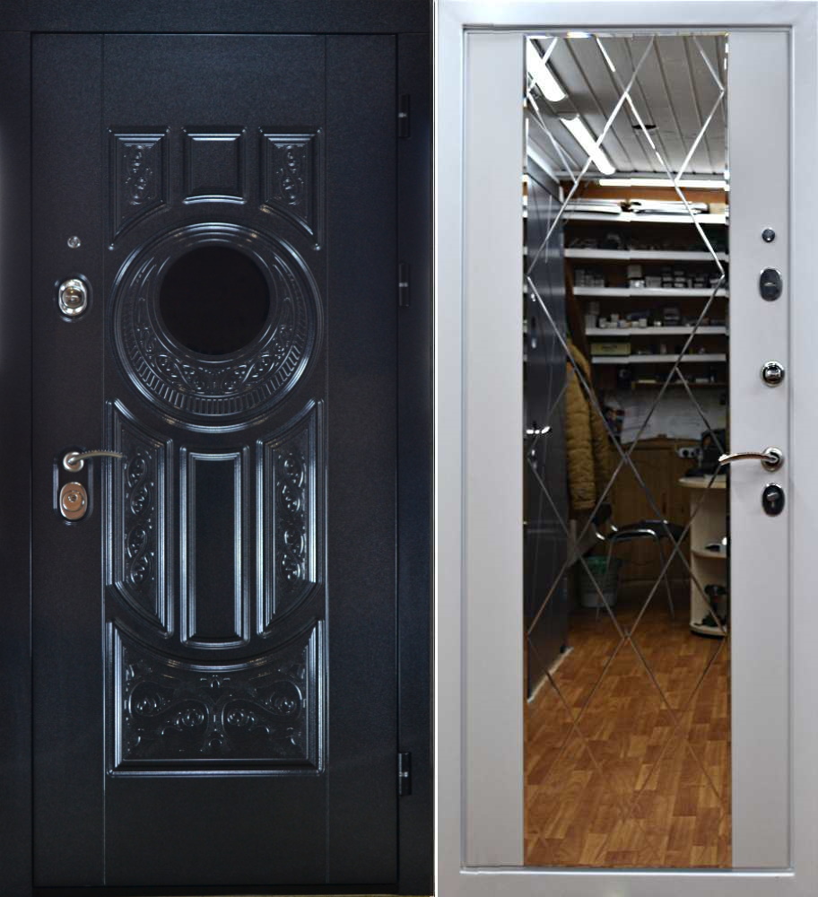 Самая красивая из входных дверей серии Принцесса, лицевая сторона покрыта чёрной плёнкой металлик и лаком, такое сочетание даёт глубокий эффект зеркальности, в центре установлено круглое зеркало чёрного цвета с фальцетом.