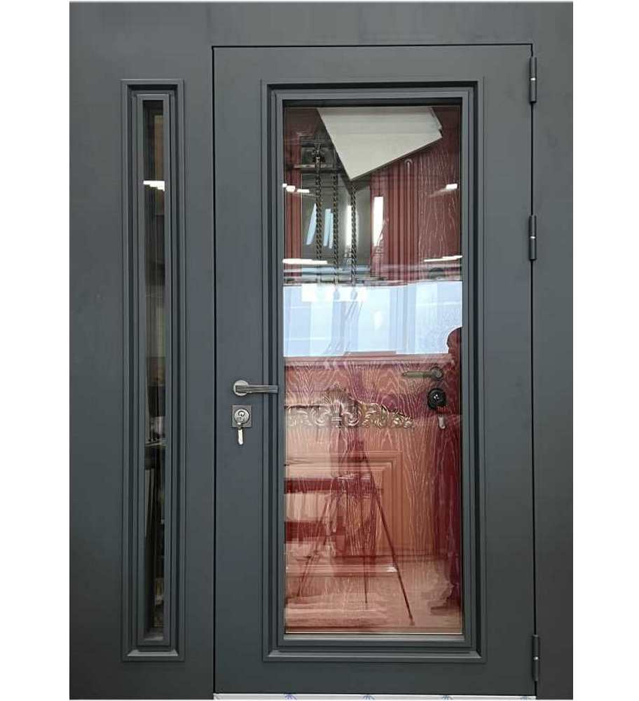 Широкая входная дверь для установки на улицу, полотно с максимальной площадью остекления, боковая фрамуга со стеклом, лицевая сторона пресс формированный металла окрашенный порошковой краской Муар, внутренняя панели МДФ.