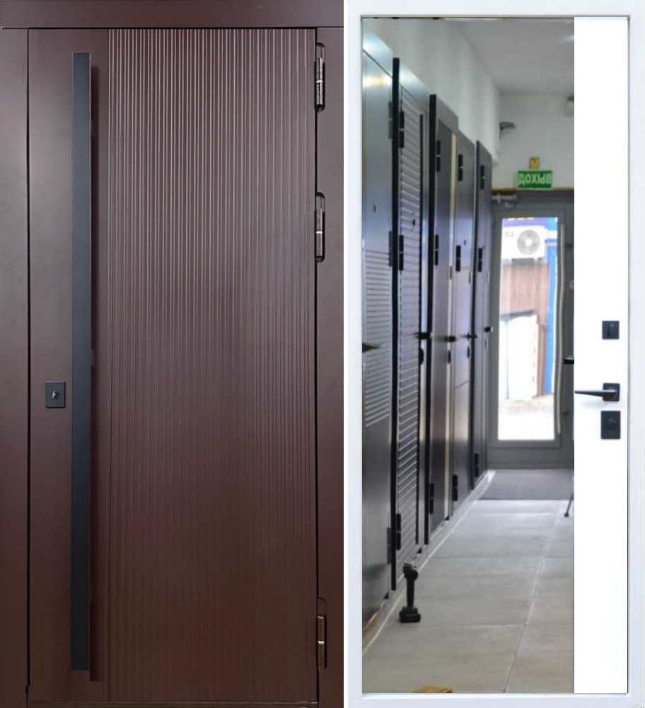 Входная противовзломная дверь из листового металла два миллиметра с зеркалом на внутренней панели и усиленной шумоизоляцией, европейская модель с механической ручкой скоба.