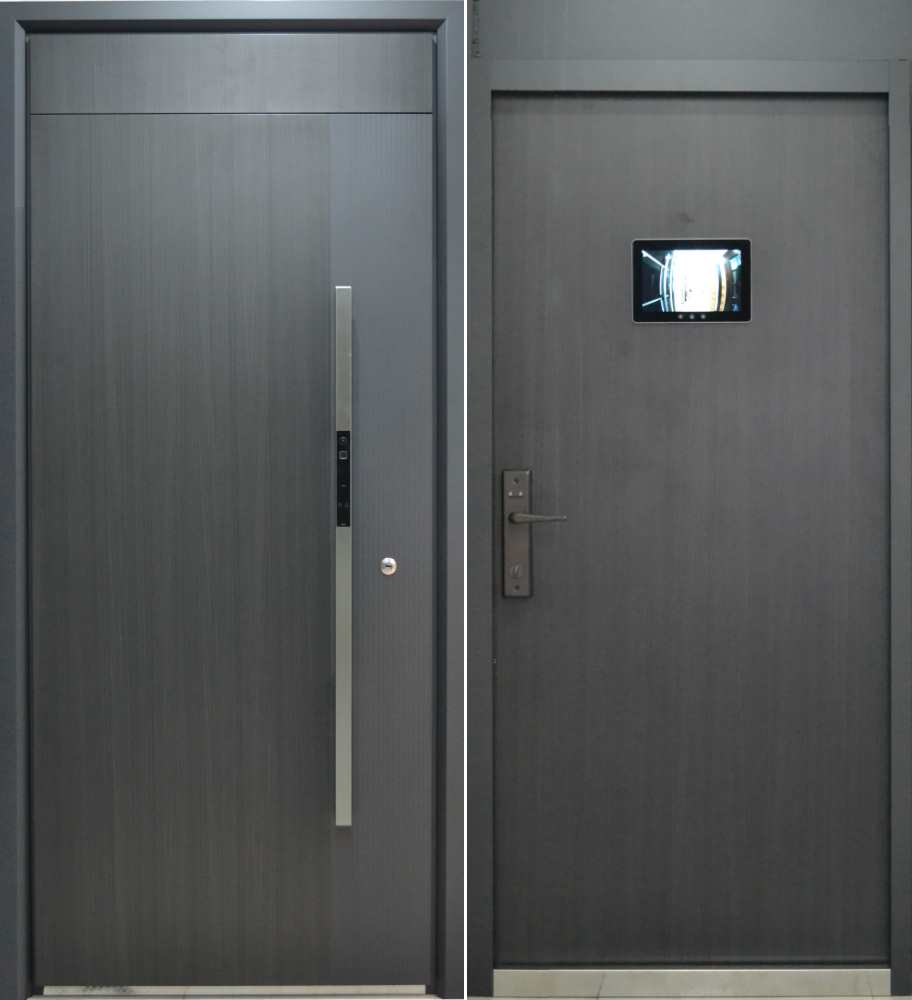 В отделке лицевой стороны использовано два материала наличник и полоса на полотне в зоне замка окрашены серой порошковой краской абсолютно гладкой, напоминает эмаль, это новейшая разработка, на самом металле в этой зоне выдавлены вертикальные полосы, остальное полотно и фрамуга покрыты антивандальной пленкой, которая вкатывается в лист металла при большой температуре и вместе с ней детали формируются это тоже редкая новейшая технология.