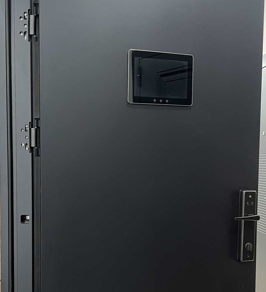 Входная дверь с четырьмя скрытыми петлями накладной фальшь фрамугой с лицевой стороны, электронным замком Eagle Lock со встроенным видеодомофоном, видео записью и большим экраном на внутренней стороне.