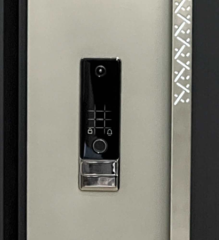 На лицевой панели расположена не большая цифровая панель с камерой, через неё происходит открытие и программирование замка, открыть его можно по коду, отпечатку пальца, картой доступа, или механическим ключом, личинка под него спрятана под той же панелью.