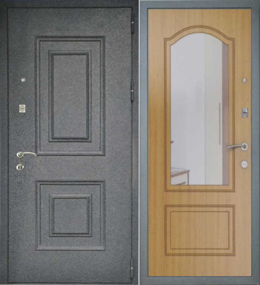 Металлическая дверь с накладными элементами, при помощи которых эмитируется филёнчатая, внутренняя сторона МДФ 10 дуб с красивым зеркалом арочной формы.