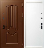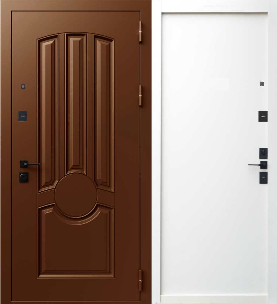 Входная коричневая, металлическая дверь для квартиры, лицевая сторона пресс формированный металл полтора миллиметра с рисунком Pillars, окрашен краской Муар, внутренняя сторона МДФ белого цвета.