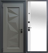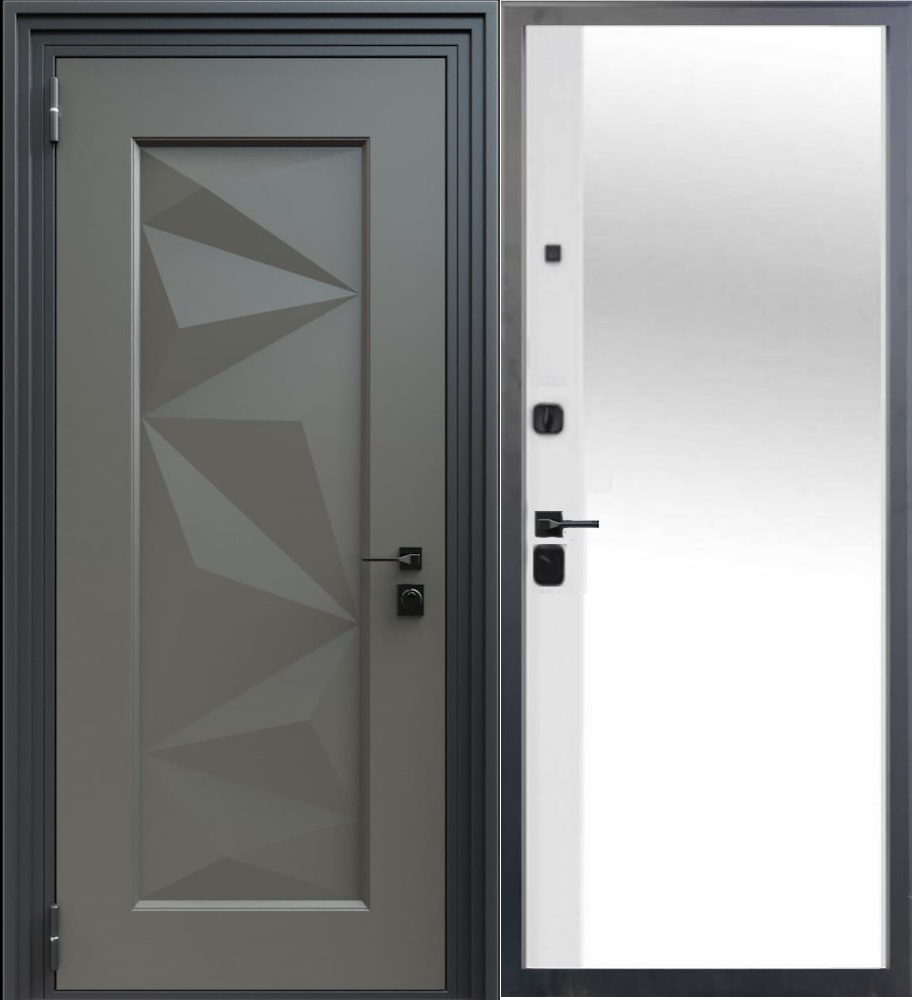 Входная дверь из 3D формированного металла, штамп на полотне Metal Styling окрашено порошковой краской серого цвета, наличник фигурный цвет чёрный, изнутри большое зеркало.
