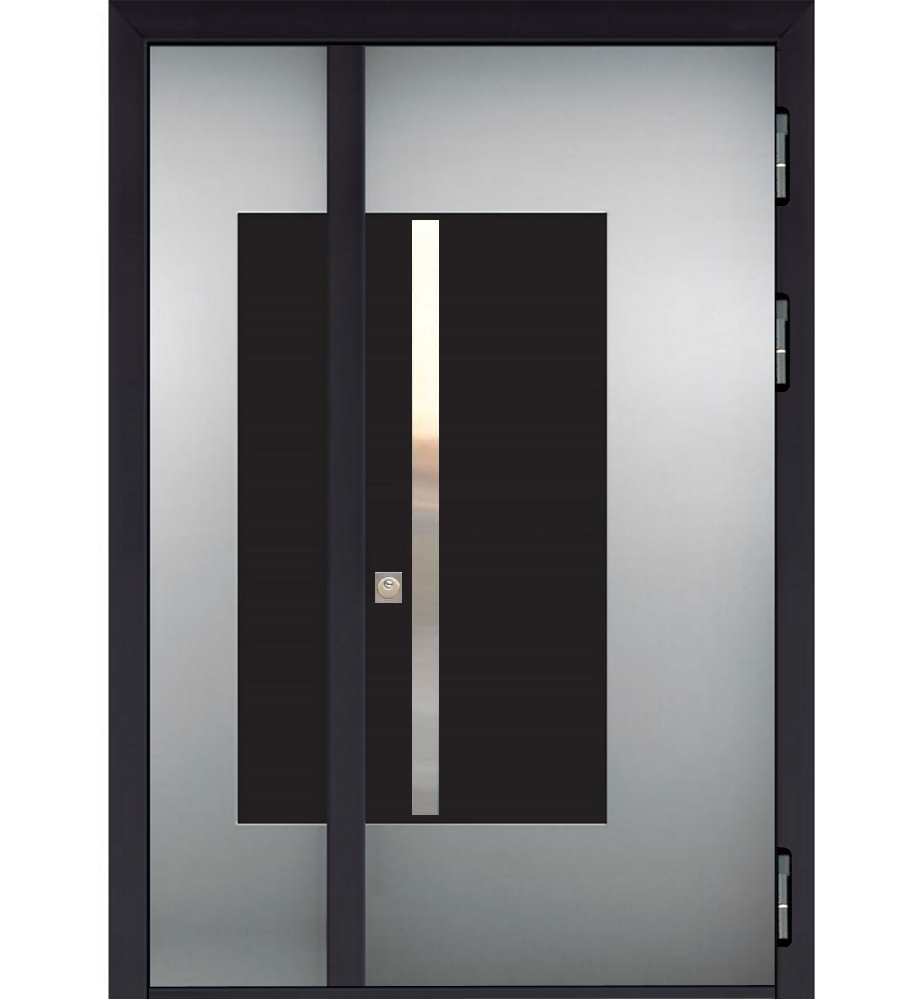 Широкая двустворчатая входная дверь окрашена в два цвета чёрный и серебро, оригинальный дизайн разработан иностранным агентством, дополнен ручкой скоба с отделкой нержавейкой.