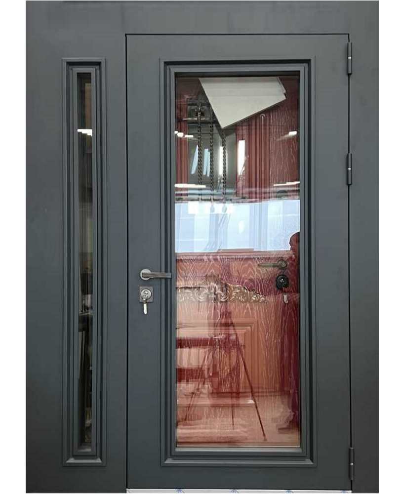 Широкая входная дверь для дома из толстого металла, на лицевой стороне пресс формированная окантовка стёкол большого в полотне и узкого в боковой фрамуге, модель Los-Angeles.