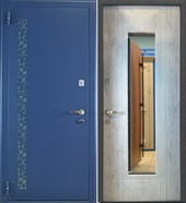 Синяя входная дверь из металла 1.5 мм, с красивой полосой вырезанной лазером под которую подложен лист серого цвет, на внутренней стороне в центре панели расположено большое зеркало.