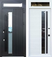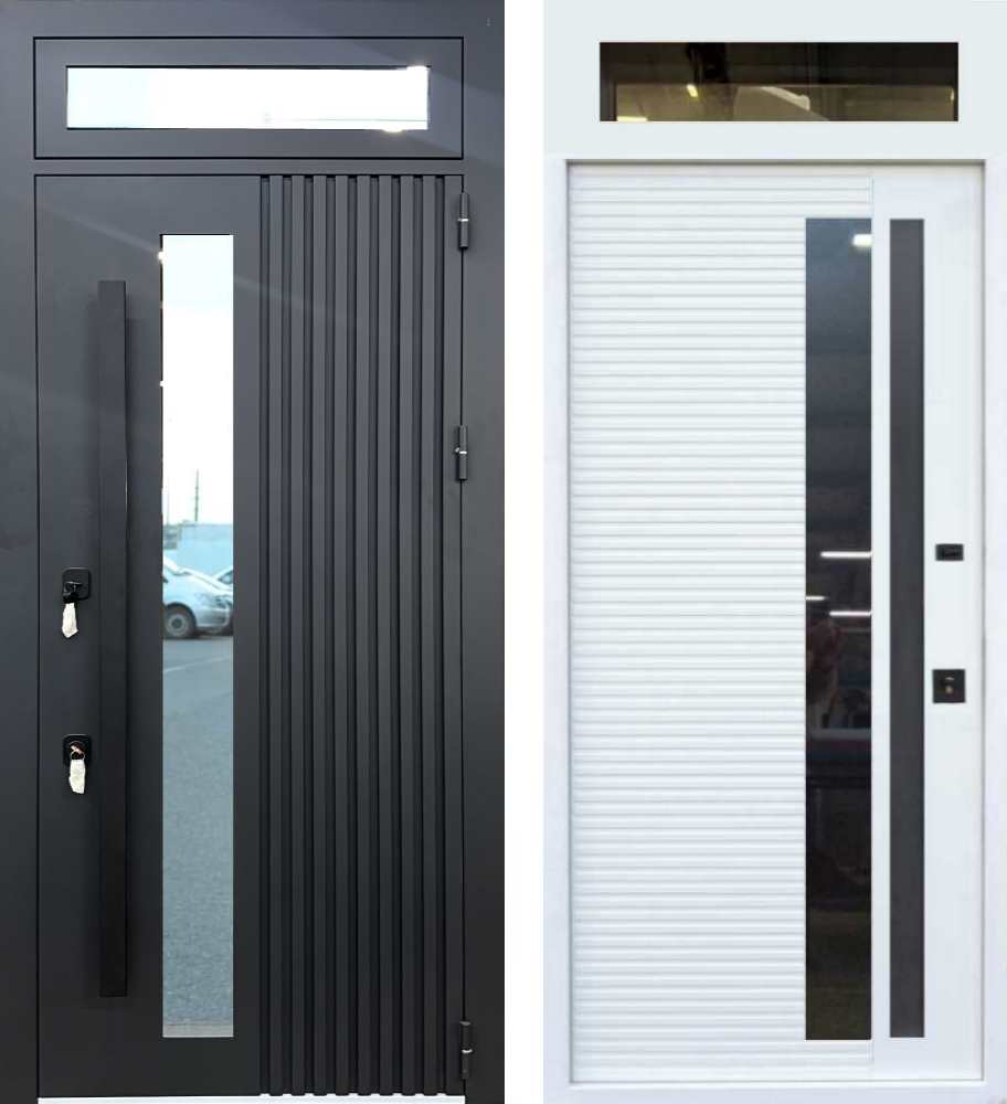 Входная дверь в европейском стиле Tuscany со стеклом на реечном полотне, ручкой скоба на лицевой стороне окрашенной в чёрный цвет и белой внутренней стороной с горизонтальной фрезеровкой и остеклённой фрамугой.
