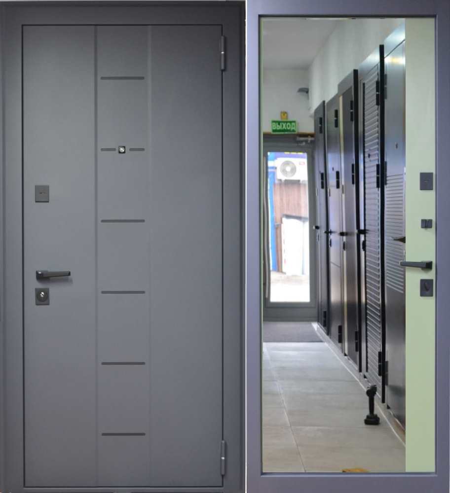 Входная противовзломная дверь Виржин из металла два миллиметра, полотно пресс формированное усиленное с шестью чёрными вставками по центру и зеркалом практически на всю внутреннею сторону.
