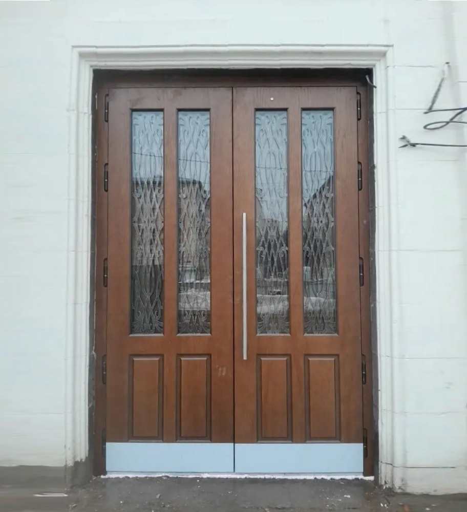 Входная двустворчатая дверь для парадной, изготовлена из толстого металла, отделана МДФ покрытым шпоном ореха, с двух сторон, в каждой из равных полотен установлены по два узких стеклопакета с внутренними решётками, вырезанные лазером из листового металла.