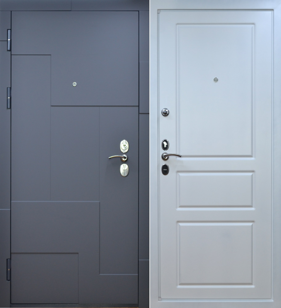 Входная дверь с повышенной толщиной полотна 115 мм, обеспечивает хорошую шумоизоляцию, изготовлена из цельного листового, гнутого металла 1.5 мм, отделана панелями МДФ серого с лицевой стороны и белого цвета изнутри.